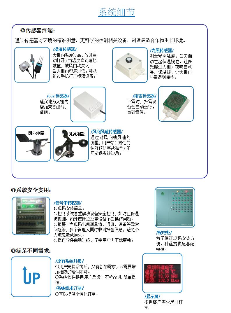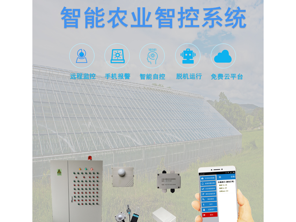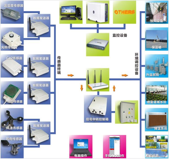 傳感器終端如溫度濕度傳感器、光照傳感器、土壤溫濕度、CO2傳感器、雨雪傳感器、風速傳感器、風向傳感器等,將信息采集發(fā)送到信號采集系統(tǒng),信號采集系統(tǒng)再通過云發(fā)送信息到電腦、手機端,通過電腦、手機端就可以直接對各環(huán)境調(diào)控設(shè)備如通風系統(tǒng)、遮陽保暖系統(tǒng)、升溫系統(tǒng)、降溫系統(tǒng)、噴霧灌溉系統(tǒng)、降濕系統(tǒng)或其它設(shè)備等進行調(diào)控。
